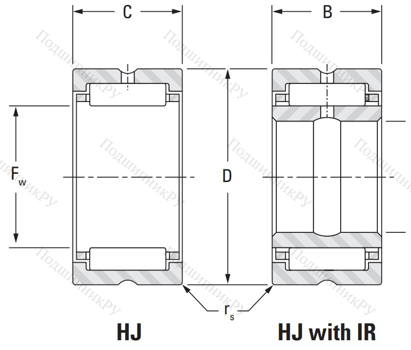 В конструкцию Игольчатый подшипник HJ 526828 входит массивная наружная обойма, обработанная машинным методом, со специальными бортами-ограничителями, предназначенными для фиксации передвижения шины относительно тела качения. Из-за отсутствия внутреннего кольца движение происходит на валу. Иголки размещены внутри стального сепаратора.
