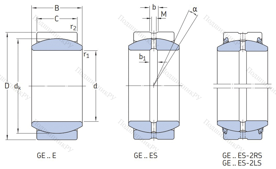 Шарнирный подшипник GE 15 ES 2RS конструкция которого представлена внешним кольцом, внутри вращается внутренняя обойма. Существуют прямые, шарнирные (самовыравнивающиеся), угловые, гидравлические, двойные шарикоподшипниковые и роликоподшипниковые варианты исполнения. Отдельные разновидности изделий (с парой трения «сталь – сталь») нуждаются в обслуживании и имеют каналы для подачи смазки, в то время как другие не нуждаются в ТО. В первом случает система включает в себя пару стальных шин, обработанную предварительно фосфатами и дисульфитом молибдена. Необслуживаемые модели покрываются политетрафторэтиленом, армируются медью и дополнительно усиливаются хромом.