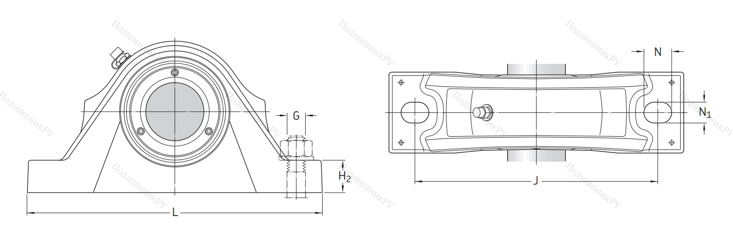 В конструкцию детали входит корпусный подшипник типа UC, установленный в корпус типа Р из чугуна с нишей сферической формы. Монтаж на вал осуществляется посредству кольца, оснащенного парой штифтов, закручиваемых шестигранником, что обеспечивает самовыравнивание.