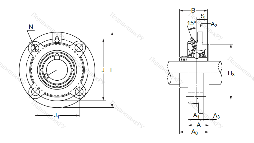 Фланцевая гильза из чугуна или стали оснащена корпусным радиальным шарикоподшипником UC-серии, имеющим внутреннюю обойму удлиненного вида и винтовой стопорной крепеж. Монтаж детали осуществляется методом подгонки.