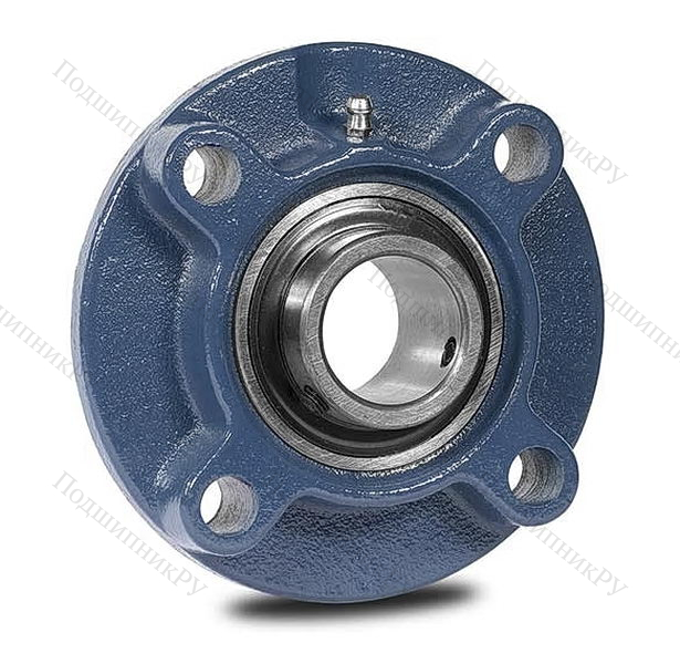 Фланцевая гильза из чугуна или стали оснащена корпусным радиальным шарикоподшипником UC-серии, имеющим внутреннюю обойму удлиненного вида и винтовой стопорной крепеж. Монтаж детали осуществляется методом подгонки.