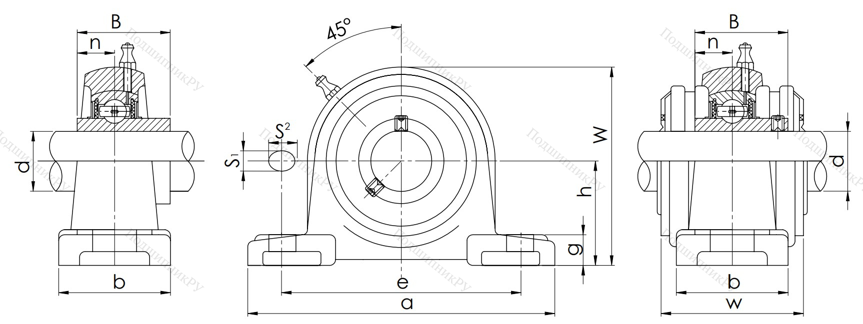 В конструкцию детали входит корпусный подшипник типа UC, установленный в корпус типа Р из чугуна с нишей сферической формы. Монтаж на вал осуществляется посредству кольца, оснащенного парой штифтов, закручиваемых шестигранником, что обеспечивает самовыравнивание.