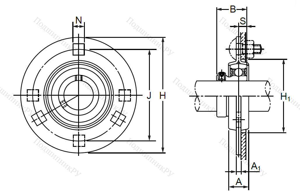 Подшипниковый фланцевый узел, состоящий из двух половин одинаковой формы, включающих три отверстия и изготовленных из штампованной стали толщиной примерно 2 мм. Может размещать в себе однорядные шарикоподшипники типа Y (SB, UC, SA, YAR, HC и другие). Наружная шина – сферической формы, за счет чего происходит самоцентрация, то есть компенсация несоосности и прочих дефектов установки.