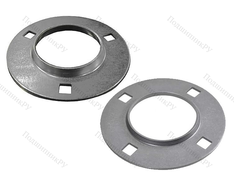 Подшипниковый фланцевый узел, состоящий из двух половин одинаковой формы, включающих три отверстия и изготовленных из штампованной стали толщиной примерно 2 мм. Может размещать в себе однорядные шарикоподшипники типа Y (SB, UC, SA, YAR, HC и другие). Наружная шина – сферической формы, за счет чего происходит самоцентрация, то есть компенсация несоосности и прочих дефектов установки.