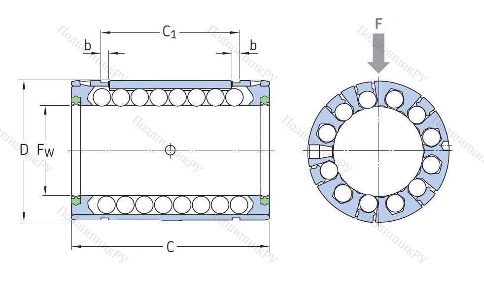Конструкция шарикового подшипника линейного перемещения включает в себя шесть продольной формы дорожек, удерживающих шарики. Предназначена для работы с валом и совершения продольного и вращательного движения. Наружное кольцо оснащено парой проточек.