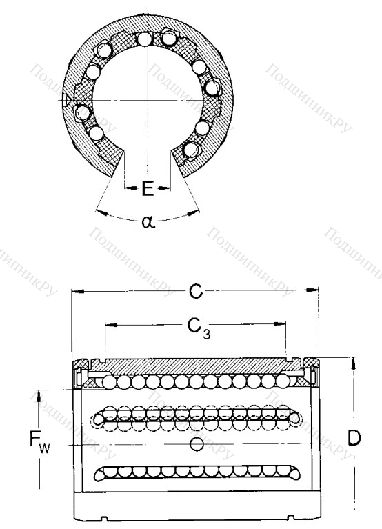 Конструкция шарикового подшипника линейного перемещения включает в себя шесть продольной формы дорожек, удерживающих шарики. Предназначена для работы с валом и совершения продольного и вращательного движения. Наружное кольцо оснащено парой проточек.