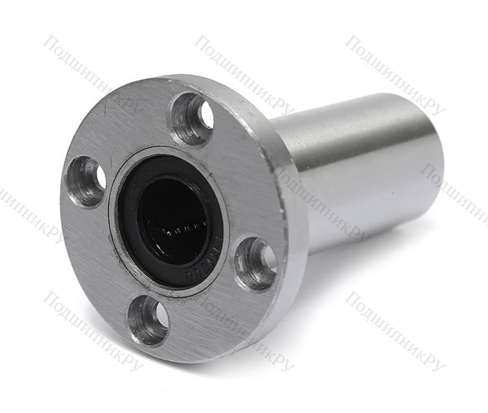 Линейный подшипниковый узел, оснащенный внешним цилиндром из стали. Имеет закрытую конструкцию и может использоваться с валом цилиндрической формы. Торец устройства оборудован круглым фланцем с четырьмя отверстиями. Может иметь уплотнения как с одной, так и с двух сторон, для препятствования загрязнениям.